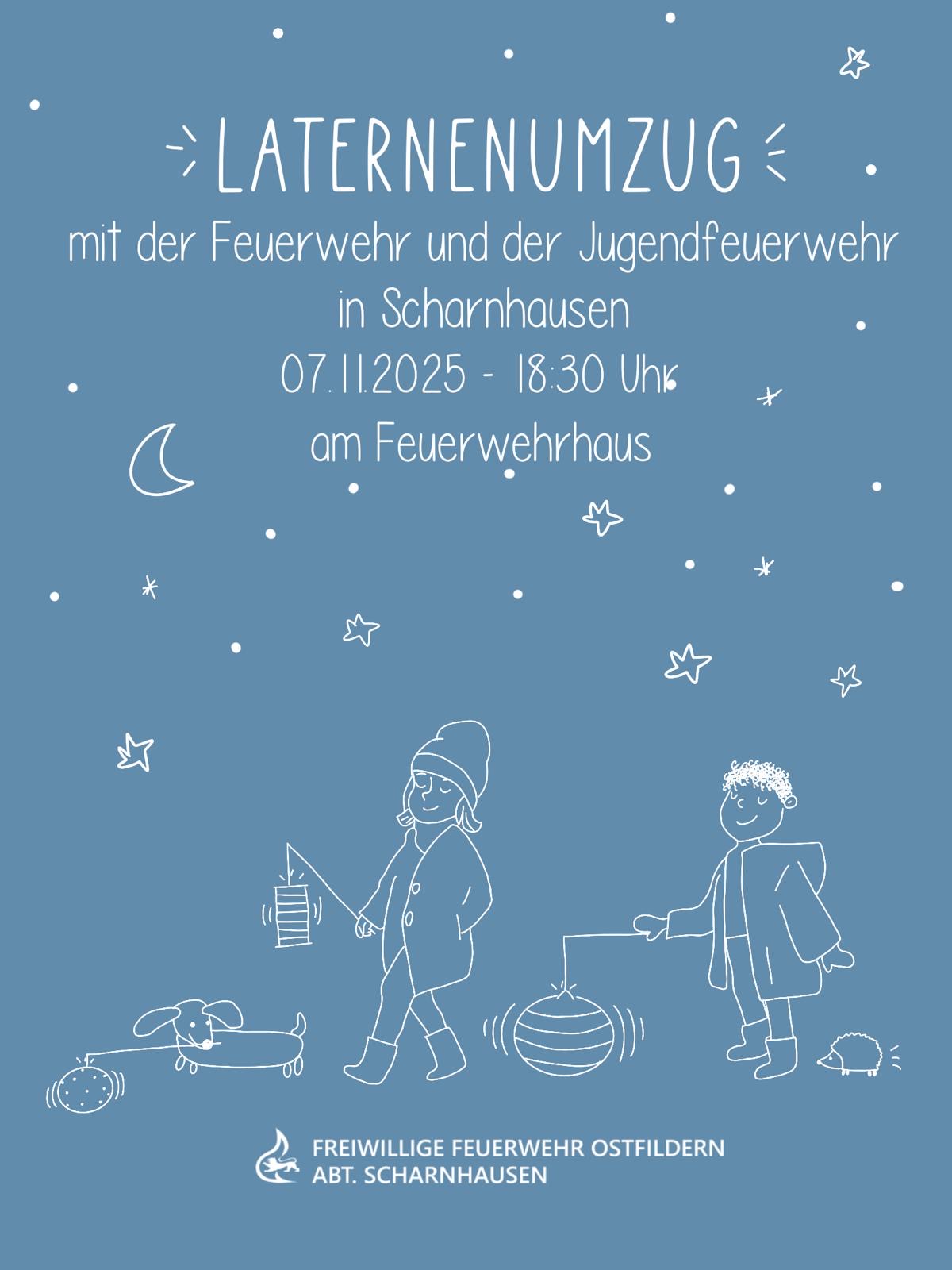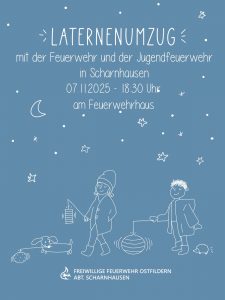 Laternenumzug in Scharnhausen am 7.11.25 11.10.25 Am 07.11.2025 beginnt um 18.30 Uhr der diesjährige Laternenumzug in Scharnhausen. Die Freiwillige Feuerwehr Ostfildern Abt. Scharnhausen freut sich über zahlreiche Teilnahme.